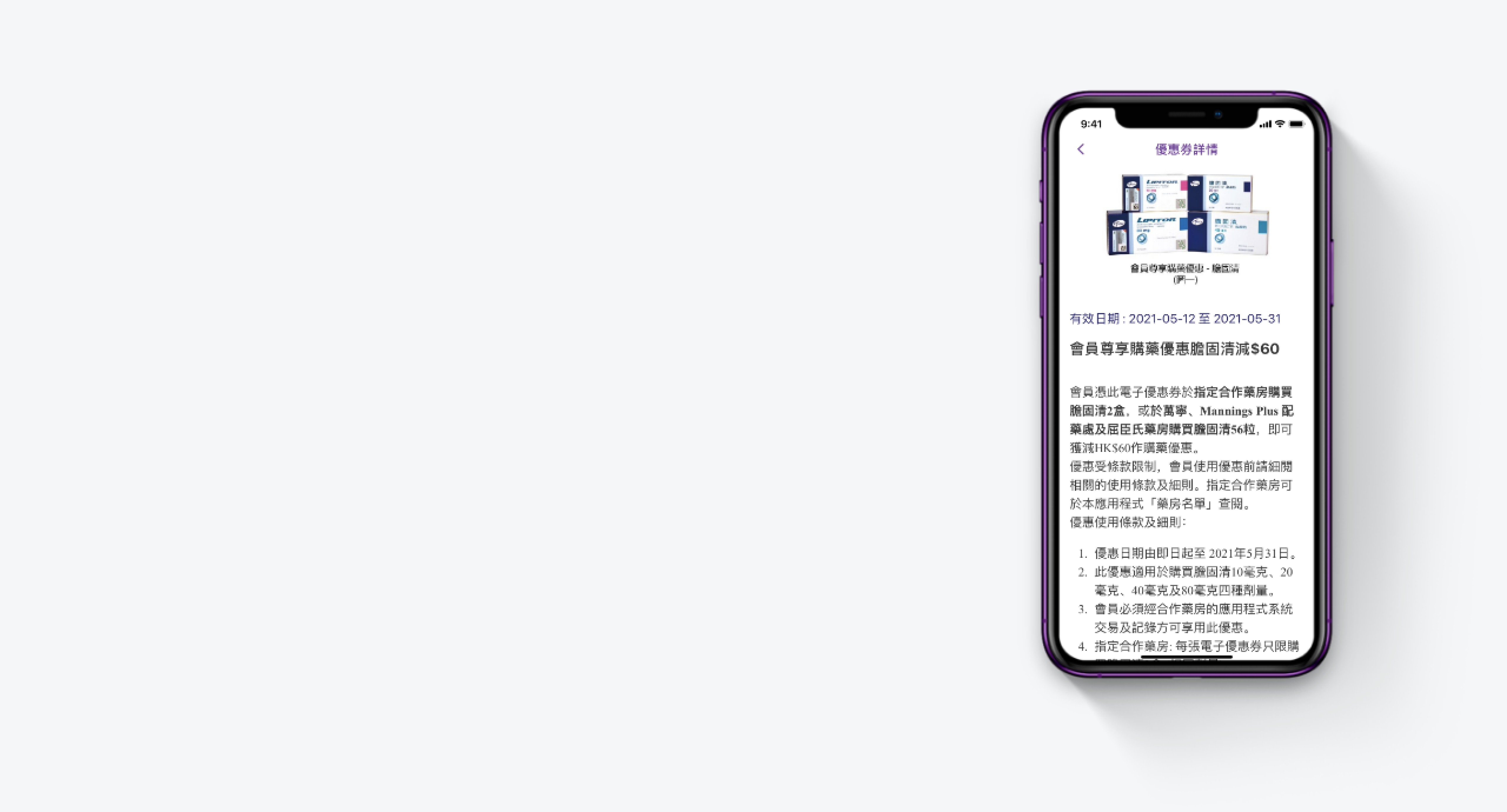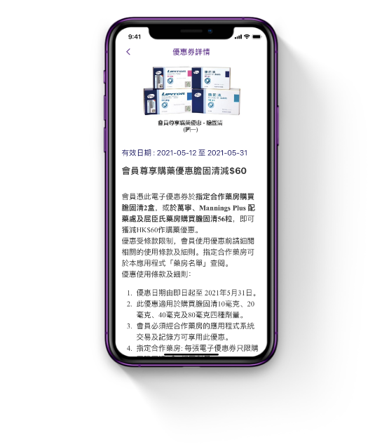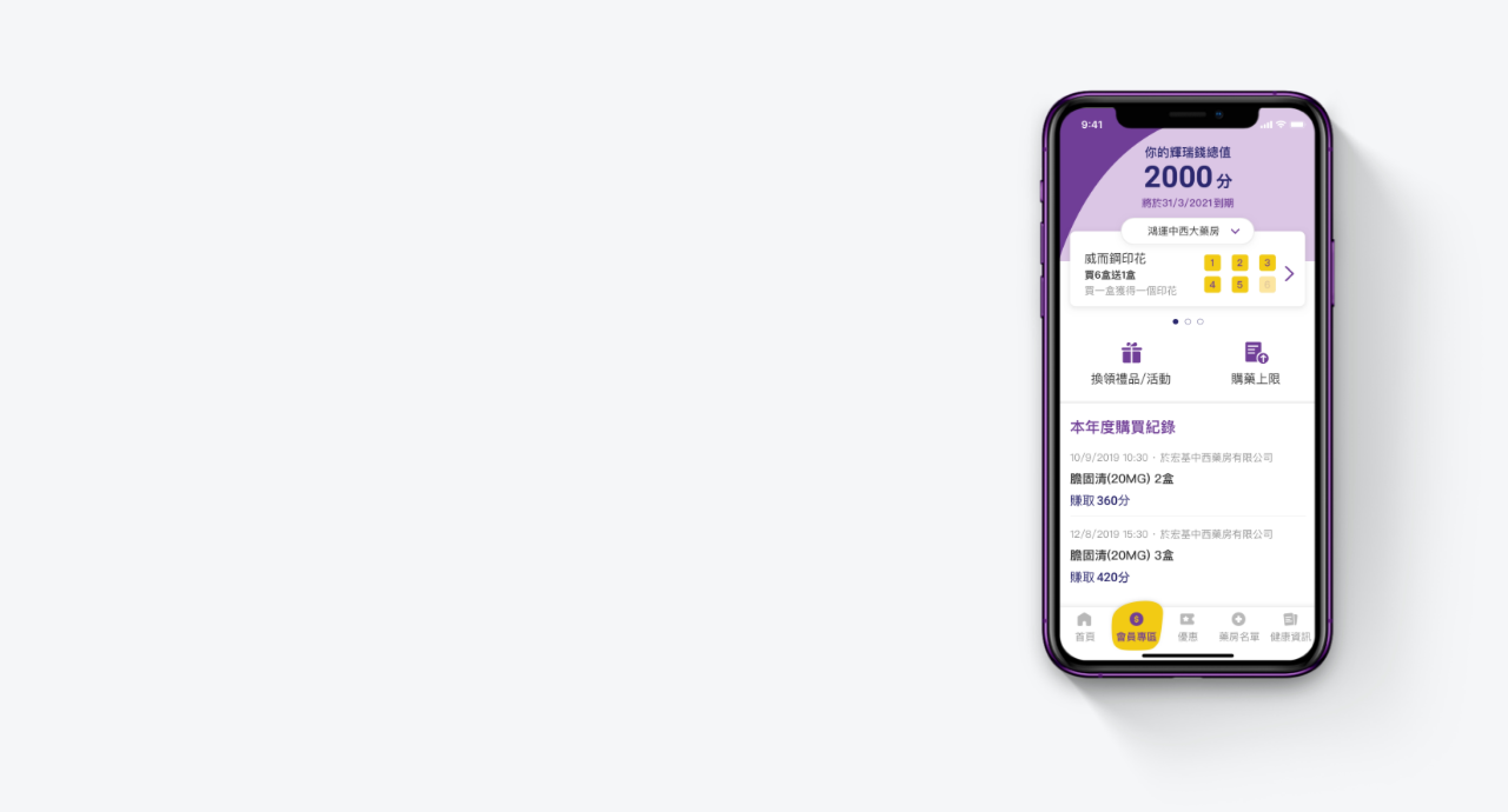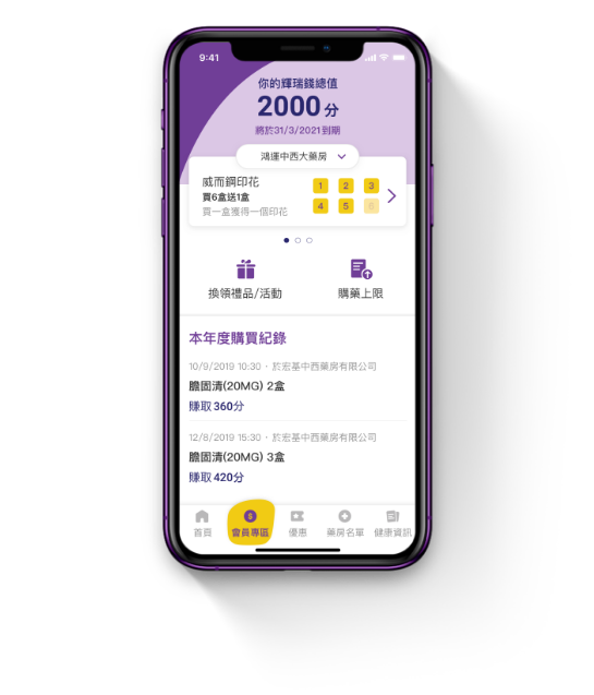 會員個人的積分、藥物印花及購藥資料詳盡記錄,讓你隨時隨地查閱最新的獎賞資訊,並一手掌握詳盡的購藥紀錄,有助你適時購藥,確保服藥的連貫性,輕鬆做好自我疾病管理!